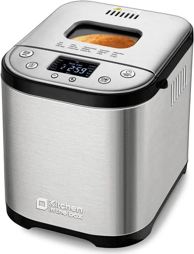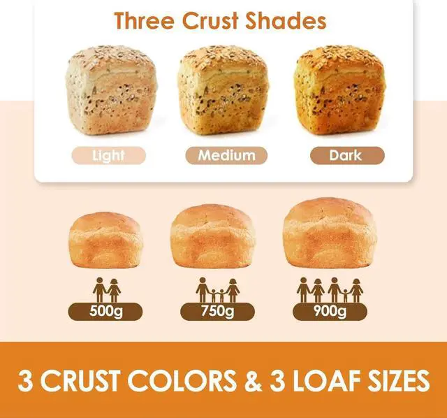[15-in-1 AUTOMATIC BREAD MACHINE with 2 LB Large Capacity ] 15 customized automatic programs include 10 Bread Menus (Soft, Sweet, natrual sourdough, French bread, whole-wheat, gulten-free, etc), 5 Non Bread Menus (Cake, Jam, Yogurt, Dough.. ). It has 3 loaf capacity of 1/ 1.5 / 2.0 lb, 3 crust color options in light/medium/dark.