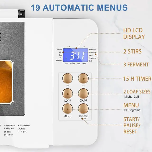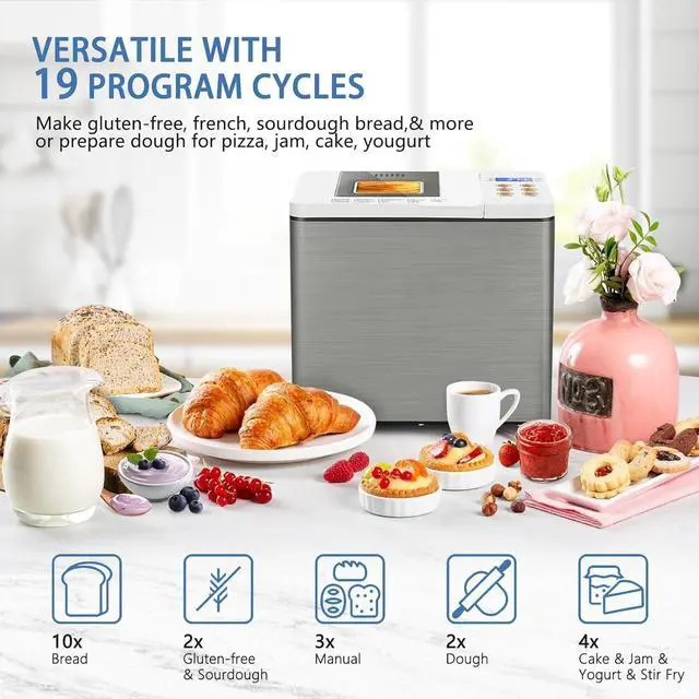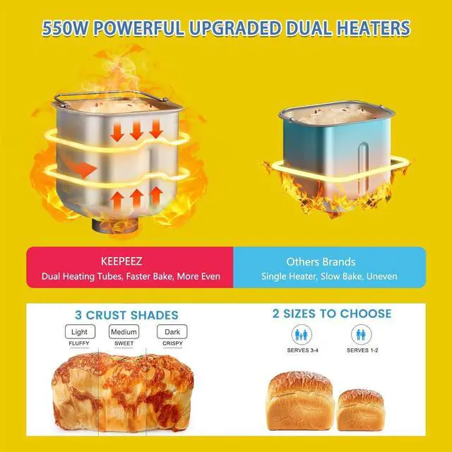 19-in-1 Multi-Function Bread maker & 2 LB Family CapacityThe most popular bread maker features 19 automatic menus including basic, gluten-free, sourdough, whole wheat bread, jam, yogurt, etc. Unique feature of stand mixer-20 Mins for fast dough. KEEPEEZ's exclusive new stir-fry rice cake and stir-fry features solve cooking problems with ease. With a choice of light/medium/dark crust baking colors and up to 2 pounds of bread, the bread machine is a must-have helper for family gatherings!
