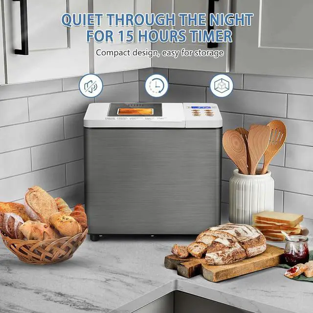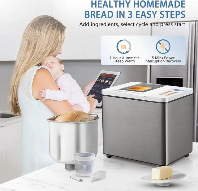 Recipes for Novices and Professionals & 15 Hour Time Delay & 1 Hour Auto Keep WarmBased on master baker's bread making experience to make recipes perfect, so that you can achieve zero mistakes when using the smart bread maker, homemade recipes are healthier and fresher. The 15 hour delay timer allows you to enjoy breakfast without waking up early, the 1 hour auto keeps warm and 20 minutes power-off recovery makes the organization more delicate, the bread more fluffy, the texture more mellow
