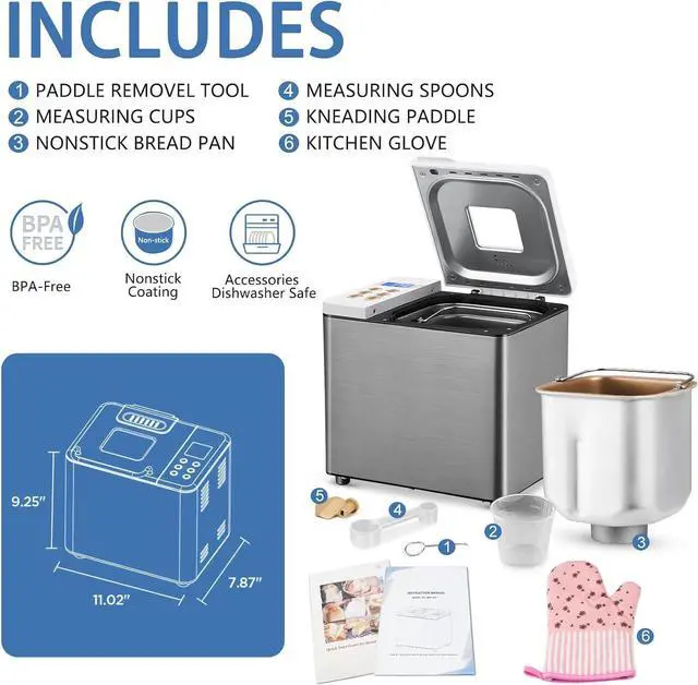 6 Practical Accessories& High Quality ETL Certified & 2-Year Long WarrantyThe bread maker comes with 1* non-stick bread pan, 1* glove, 1* measuring cup and spoon, 1* hook, 1* kneading paddle, all dishwasher safe, saves time and effort. If you have any problems with the bread maker, we provide 2 years super long warranty. Accessory replacement can be used all the time. 12 hours fast customer service response. Enjoy a great shopping experience with the KEEPEEZ Professional bread machine!