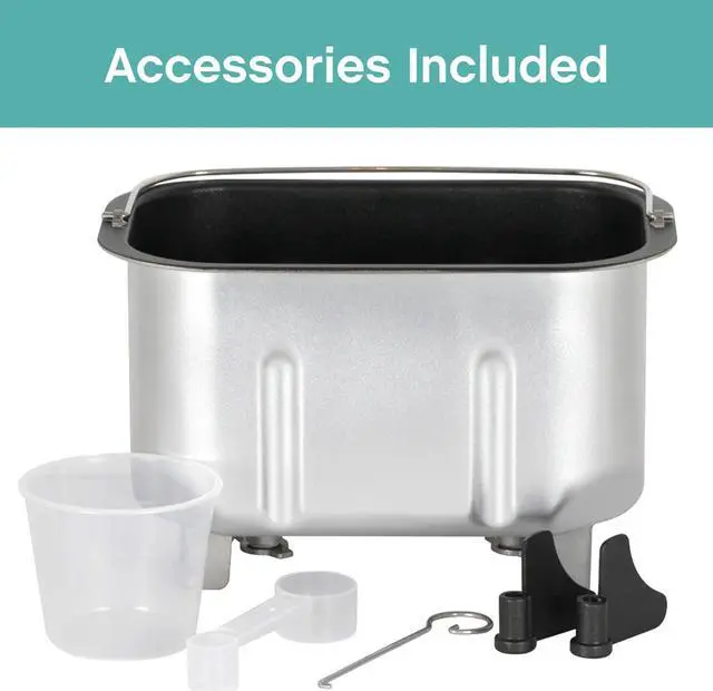 included components: Bread Maker, Bread Pan, Care and Use Instructions, Measuring Cup, Measuring Spoon, Knead Blades, Knead Blade Removal Tool