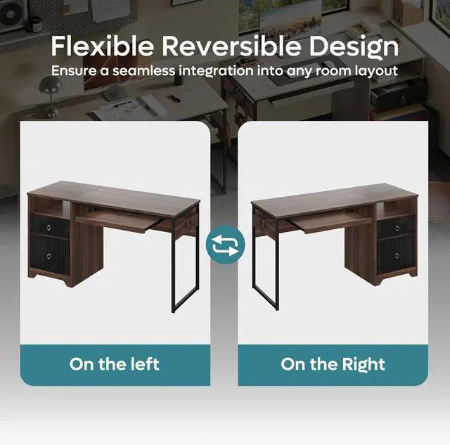 • Adaptable Layout: With a flexible keyboard tray and reversible pedestal, this desk fits any room. Two hooks for accessories like headphones add convenience.