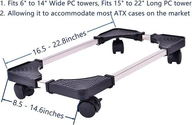 2.Pretty wide and long dimensions or get fairly narrow and short, CPU stand is adjustable from width 8.5” to 14.6” , adjustable from length 16.5” to 22.8”