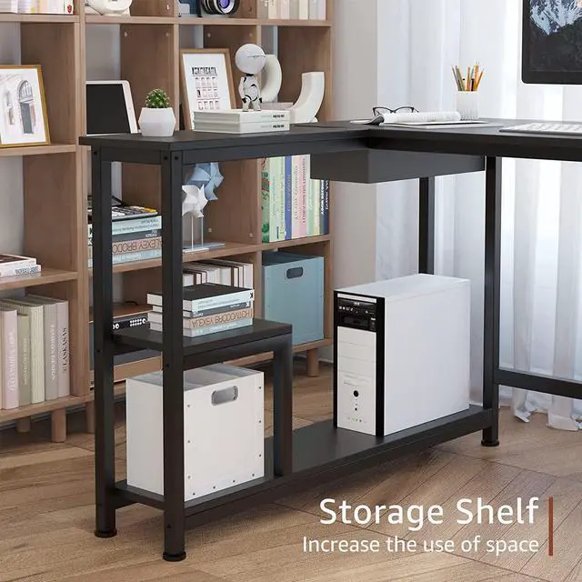 Ample Storage SpaceAn open 2-tier storage shelf on the side provides a perfect home for your books, and there is plenty of space for you to place the host, Keep everything you need at work within arm's reach.