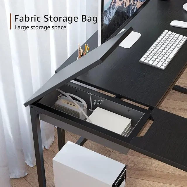 Spacious WorkspaceThe 46.3" x 18.9" writing surface is a decent size to accommodate a monitor, keyboard, or laptop. After the flip on the table is opened, there is a fabric storage box, you can put some items.