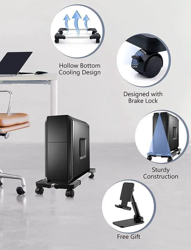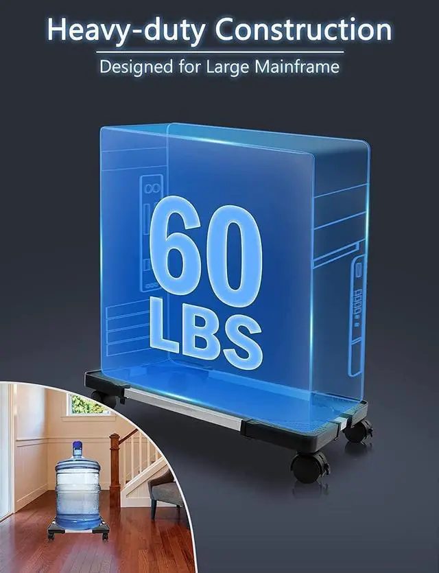 Easy to AssembleThe mobile CPU stand provides a efficient way to move and store the computer tower, withstands moderate forces (60 LBS) and allows you to assemble it in the shortest possible time without tools. Heavy-duty design, ABS and stainless steel tube construction make the stand durable, lightweight and compact.