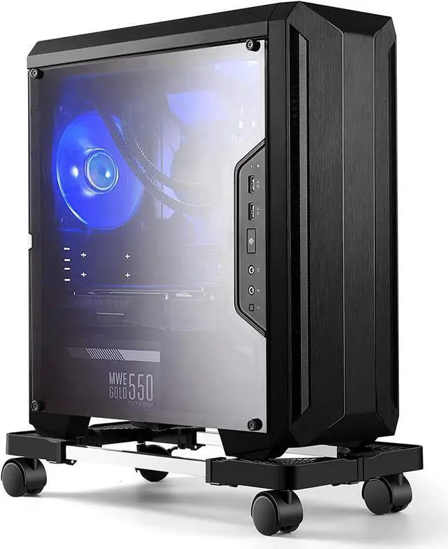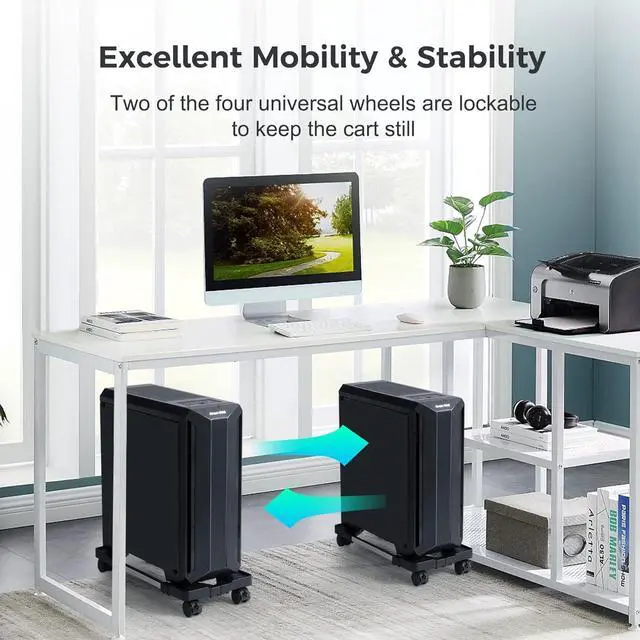 C. Free Mobility The tower stand can be moved in all directions to be placed where you want, you can use it at home and office freely, it is with 4 universal rolling wheels, two of them is lockable casters, it is better to install them at the same side of the front, it is more easy to move under your computer desk and stay in place, pc tower stand.