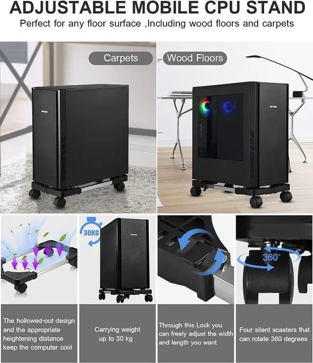 Mobile CPU Rolling Support: There are four casters, which can be rotated 360 degrees, which is convenient to move. When not in use, the steel pipe can be locked to keep the CPU support in place. At the same time pc tower stand, tower stand, pc stand, cpu stand, computer tower stand are convenient to place and easy to clean the floor. (Please press hard when installing the wheels, and only when you hear the sound of the click is the installation complete)
