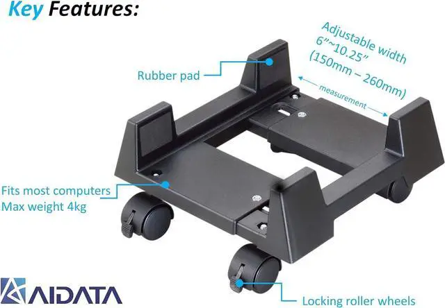 FITS MOST COMPUTERS The computer cart can be adjusted between 150mm to 260mm (6 inches to 10.25 inches). Rubberized padding on the PC stand clamps hold your computer securely on the CPU stand, and a powder coated finish to ensure it does not scratch your valuable computer.
