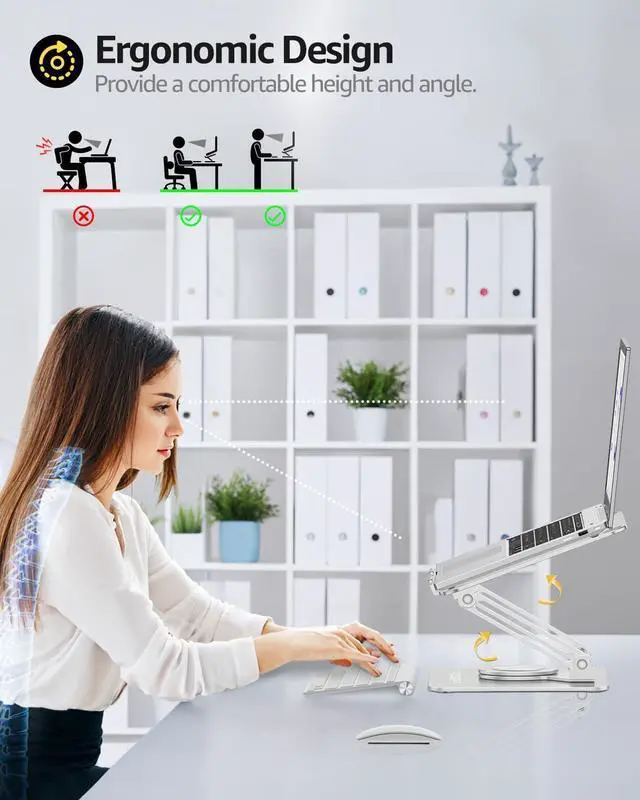 Ergonomic DesignYou can free adjustable laptop stand height and angle to a perfect eye level and helps to reduce shoulder and neck pain. Which ensures you in a comfortable position no matter sitting down or standing up.