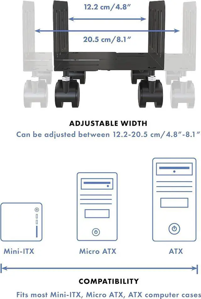 [ADJUSTABLE WIDTH] The width can be adjusted between 4.8 - 8.1 / 12.3 cm - 20.8 cm to perfectly accommodate for most computer towers.