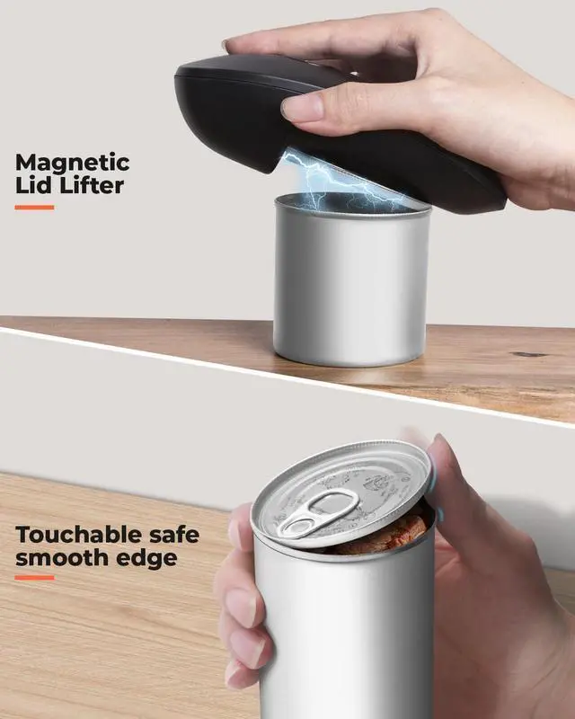Smooth Edge & Food Safety The hands free can opener cuts along the side of the lid rather than the top leaving a safe smooth edge, without touching the food inside. The underside magnet catch the lid and makes it easy to remove the lid. There is another lid remover at the end of the product to help remove lids from sticky food cans or high-pressure ones.