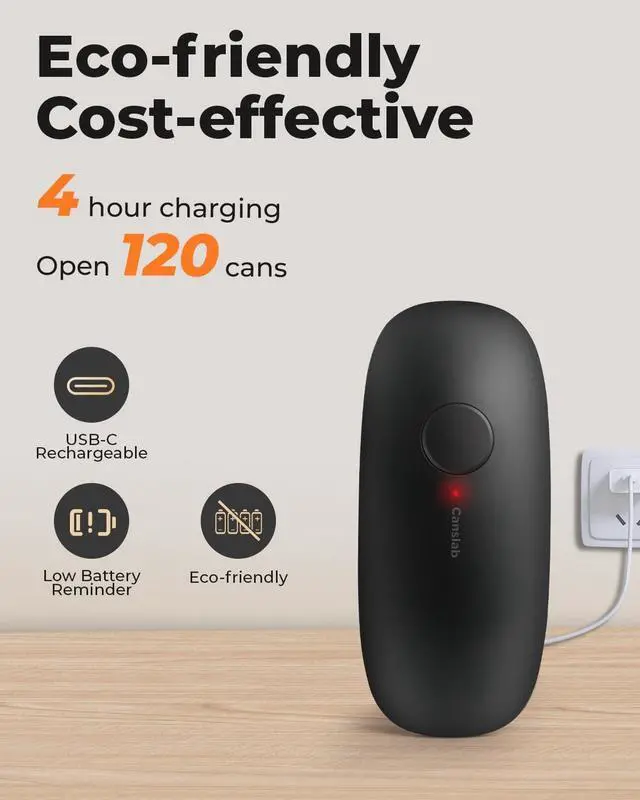 Rechargeable & PowerfulCanslab USB rechargeable can opener has a built-in 2000mAh rechargeable battery that opens approximately 120 cans*, which is 4 times the quantity cut by the aa batteries type until the batteries are drained. It is a cost-effective and eco-friendly choice. Best for home kitchen and outdoor camping. *Data from Canslab lab, can sized 10.75 oz. The number of cans opened may vary depending on the size of the can.