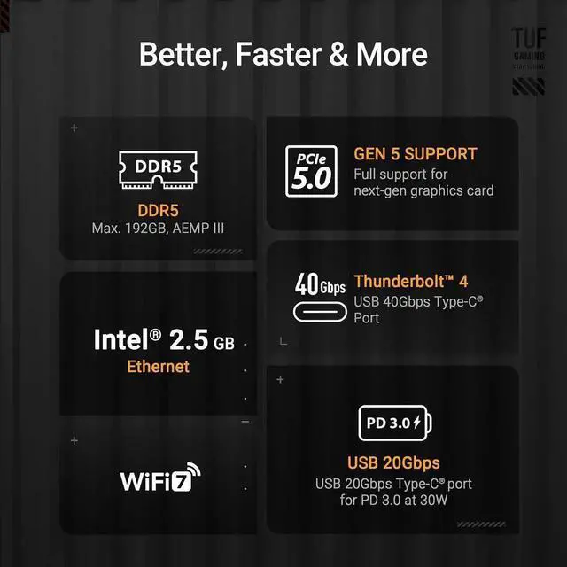 • ASUS TUF Gaming Z890-PRO WiFi Z890 LGA 1851 ATX Motherboard, Intel® Core Ultra Series 2 Ready, Advanced AI PC-Ready, 16+1+2+1 Stages, DDR5, PCIe® 5.0, Thunderbolt 4 Type-C, 4X M.2, Wi-Fi 7, 2.5Gb