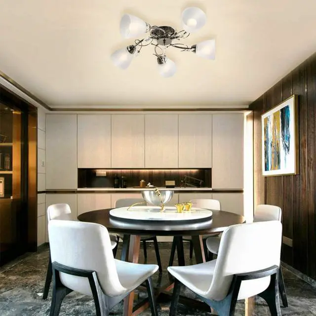 Good quality materials, metal housing, with 5 tulip shaped white glass globes add a chic and effective lighting effect to any room in your home with our 5 light ceiling set which will complement any decorating style.
