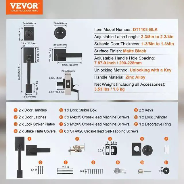 The front entry door handle includes all essential hardware components and a user manual. Easily install it with a screwdriver. There is no need for professional door hardware installation. It is suitable for doors with a thickness range of 1-3/8 to 1-3/4 inches.