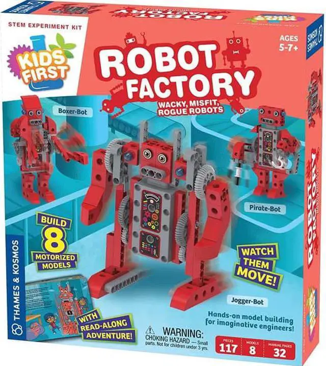 Watch out robots gone Rogue! In this new adventure in the kids first early engineering series the Omega family takes a trip to a robot factory where the robots have gotten a little out of control. One by one The wacky motorized robots are fixed up and put back into working order with the help of the omegas and you! As you follow along with the 32page illustrated storybook manual youll build working models of the eight different classic robots and experiment with them to see how each one uses the batterypowered motor gears and other mechanical parts to move its arms or legs in a different funny zany way. Through building and experimenting kids get a unique look at how simple mechanical systems work. Large cubic plastic building pieces make it easy for small hands to put the models together. Robot factory provides an engaging way to teach simple engineering concepts to young children allowing parents teachers and caregivers to lay the groundwork for strong stemrelated skills and comprehension at an early age. Model building and experiments develop fine motor skill mechanical engineering skills visualspatial skills and reasoning and concept development skills.