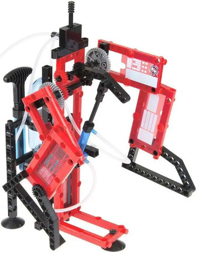 The models use a pneumatic system which uses air pressure to activate the models. Pump up the air reservoir with the hand pump then flick the switch to operate the model: A pneumatic piston enables the grabber claws to open and close rapidly and to grip objects with enough force to lift them. The piston can also move the arms and legs on models back and forth demonstrating how robotic limbs move.