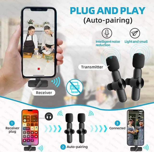 • Plug and play: No Adapter/additional APP/ Bluetooth needed. Just clip the wireless lavalier microphone to your collar and plug the receiver on your devices and power on the microphone.