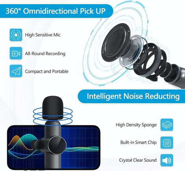 Omnidirectional Sound & Noise CancellationWith intelligent technology chip, 360°omnidirectional pickup mode. The wireless mic is equipped with sponge windshield to reduce wind noise and plosives, AI algorithm intelligent noise reduction module can accurately filter various noise and has strong anti-interference ability.