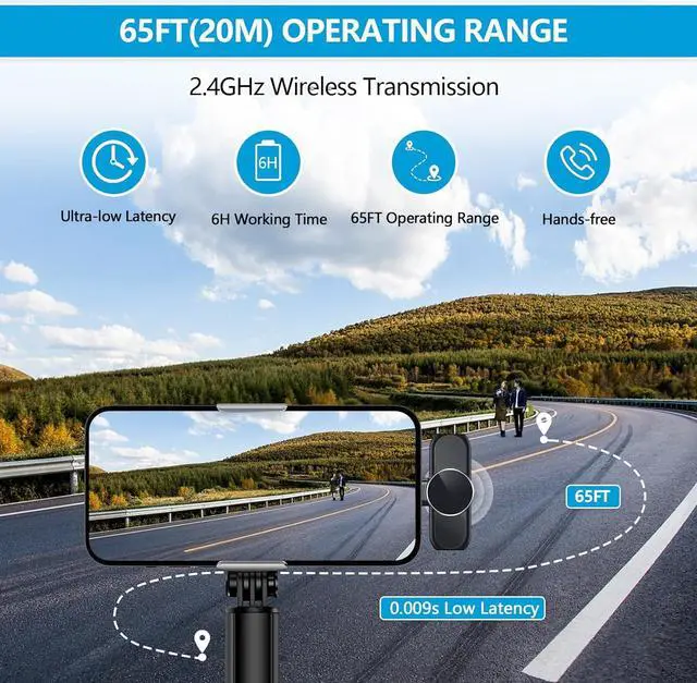 Long Working Time & 65ft Wireless TransmissionThe podcast microphone can be used for up to 6 hours after charging for about 1.5 hours. And it supports an effective connection distance of up to 65 feet, with a transmission delay of only 0.009 s, allowing you to move around while video recording.