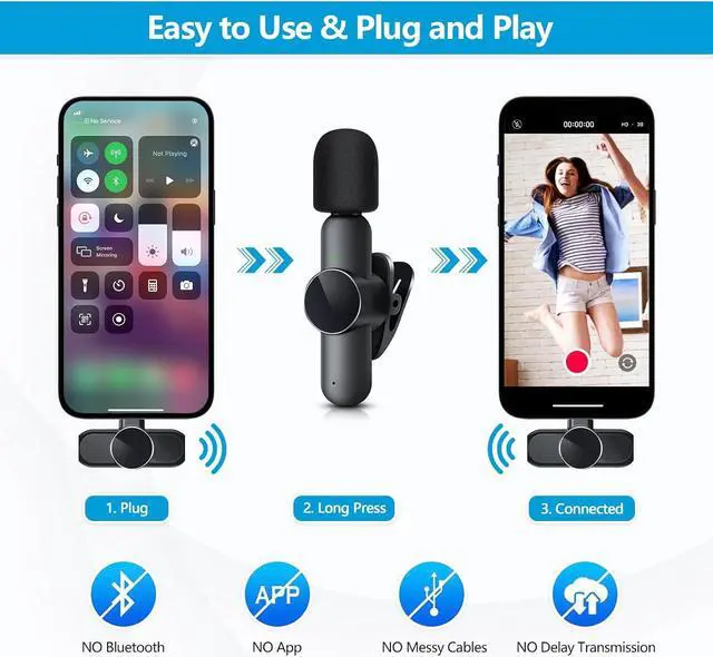 Plug & PlayNo Adapter, Bluetooth or Application required! Just plug the receiver into your devices, press the mic button, and when the indicator light turns green, the connection is successful. In addition, you can also charge your USB C/Type-C port smartphone device through the receiver, achieving recording while charging.