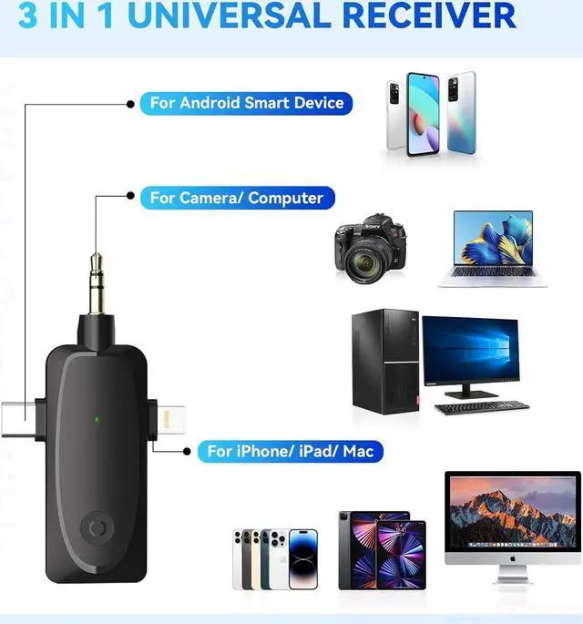 3 in 1 Universal Receiver The upgraded lapel microphone comes with a 3 in 1 universal receiver, eliminating the need to replace multiple individual interfaces or interface cables. It is compatible with a wide range of devices such as iPhone, iPad, Android phones, DSLR cameras, laptops, etc.