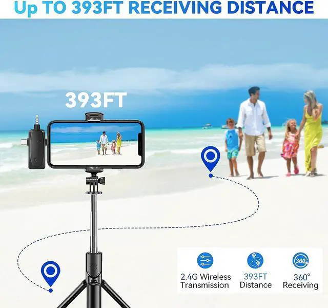 2.4G Wireless TransmissionThis wireless lavalier microphone uses 2.4G wireless international universal frequency band. Featured with fast connection, high signal stability, low interference and short audio delay. The transmission distance between the transmitter and the receiver can reach 120m (393ft) without obstacles.