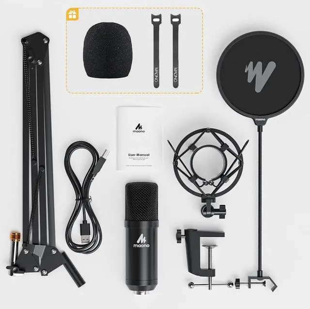 PACKING LIST: Condenser Mic + Adjustable Scissor Arm Stand + Metal Shock Mount + Pop Filter + Foam Mic Windscreen + Table Mounting Clamp + USB-B to USB-A Cable.