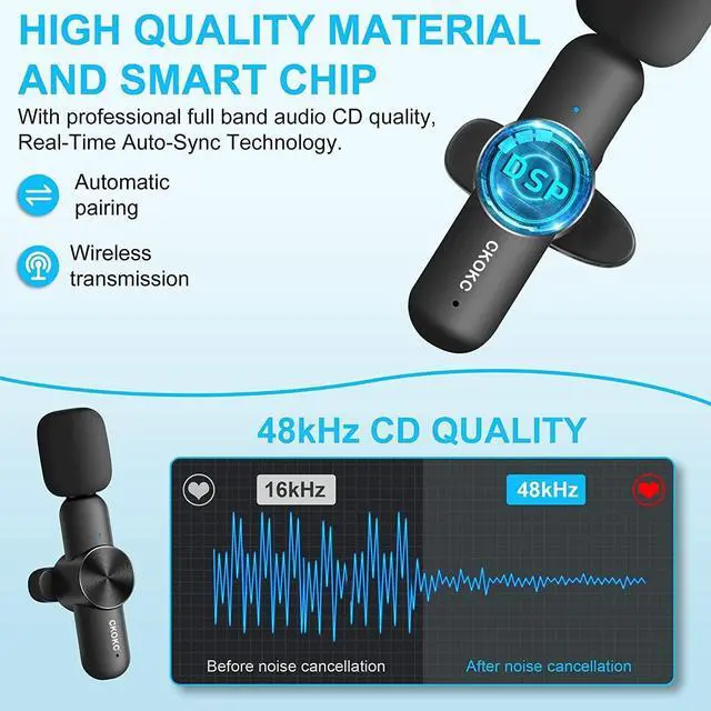 Omnidirectional Mic with Noise ReductionWith intelligent technology chip, the omnidirectional condenser lavalier mics pick up sound from all angles, and offer stable full-band 48KHz CD quality. Its built with a sponge windscreen to reduce wind noise and plosives, AI algorithm intelligent noise reduction module can accurately filter all kinds of noise and has strong anti-interference ability. It can easily cope with various noisy environments and truly restore human voices.