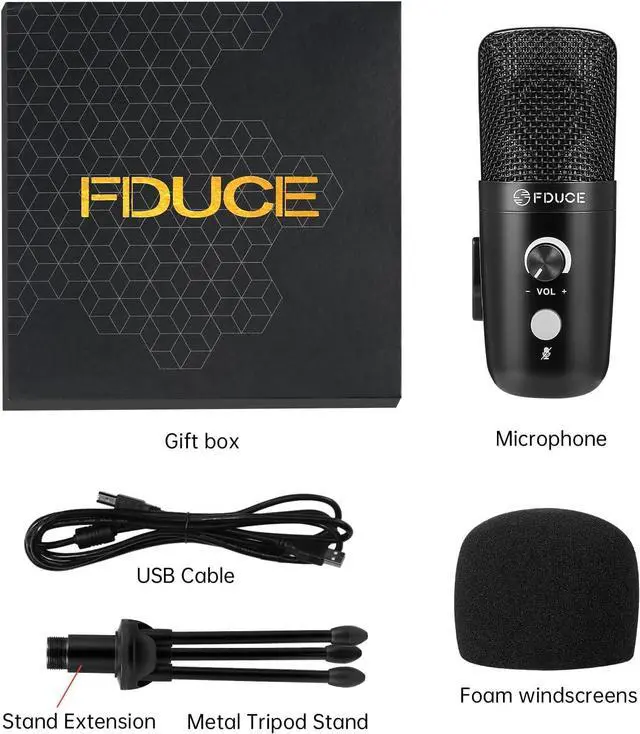 Package Contents & WarrantyThe package includes Microphone x1, USB Cable (with noise reduction head) x1, Tripod Stand x1, Stand Extension Kit x1, windscreen Foam Cover x1, Manual x1. FDUCE provides 1-year warranty and 7-day free return & replacement. If you have any problems of this product, please feel free to contact us anytime.