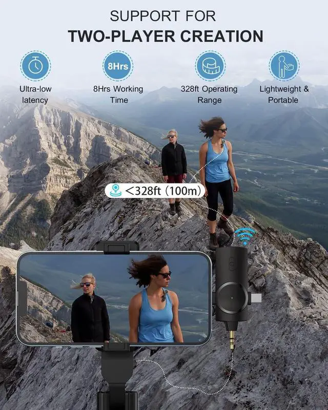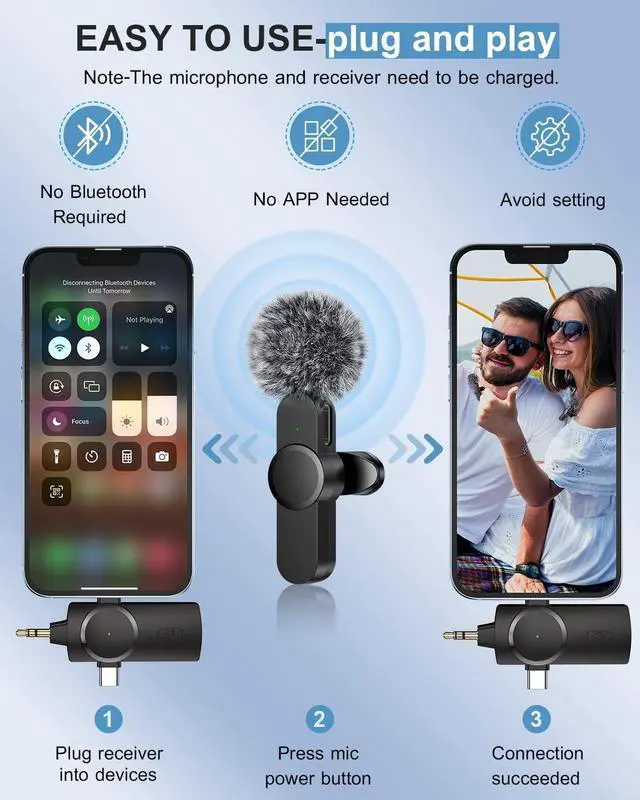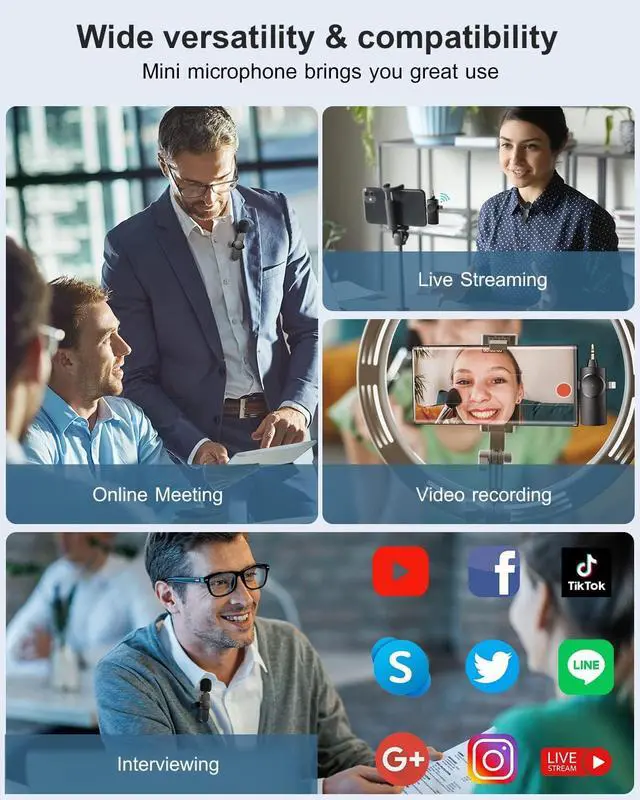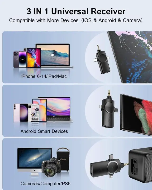 Wide CompatibilityThe upgraded wireless clip-on microphone has a 3 in 1 universal receiver. No need to replace multiple individual interfaces or interface cables. Compatible with iPhone, iPad, Android Phones, DSLR camera, Laptop, MacBook, GoPro, Camcorder, etc.
