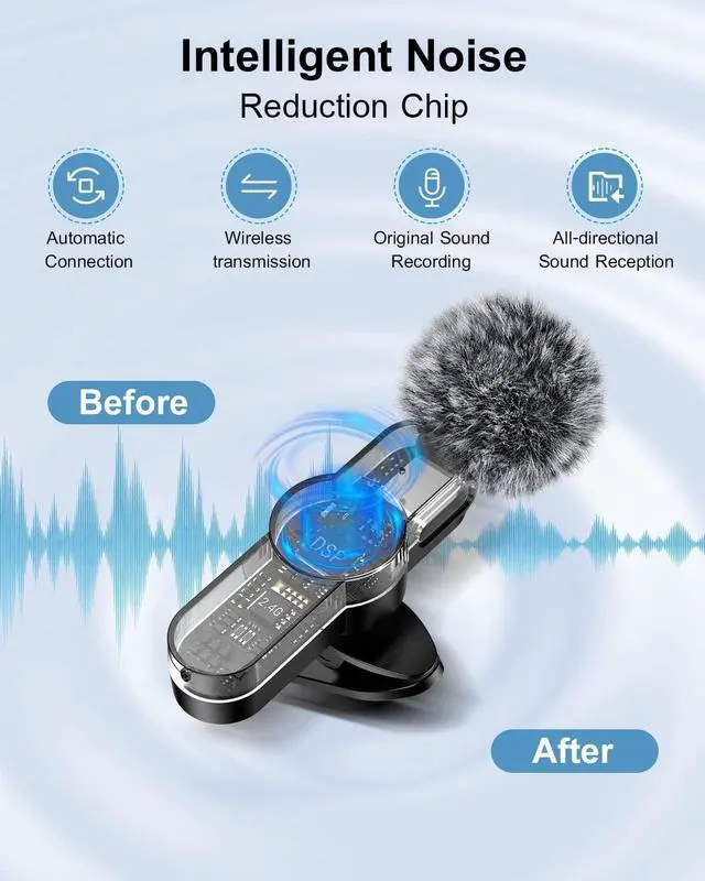 Noise Cancellation & CD-level Audio QualityThis professional microphone has a built-in noise reduction chip, more effectively identifying the original sound in noisy environments. Wireless Lavalier mic has omnidirectional sound reception technology and records every detail.