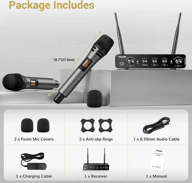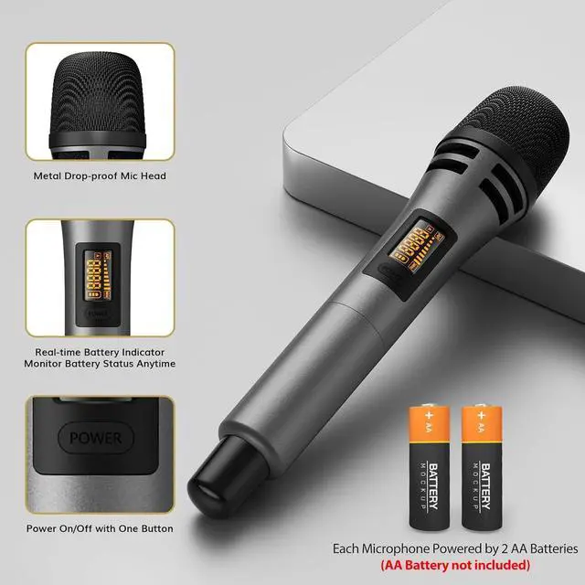 Easy to Operate: Simply plug the receiver into your sound source, insert 2 AA batteries (AA Batteries NOT INCLUDED) into each microphone, turn on both the receiver and microphones, and they will automatically synchronize.