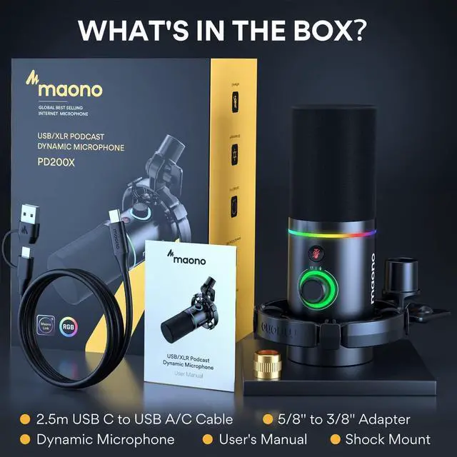 WHAT'S IN THE BOX: Dynamic Microphone, Shock Mount, 2.5 m USB-C to USB-A/C Cable, 5/8'' to 3/8'' Adapter, User's Manual, 18
