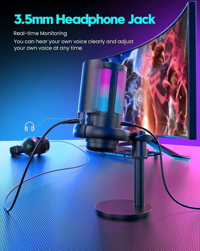 Practical and convenient function: The top of COCONISE gaming microphone is equipped with a one-button mute touch sensor. When you want to close the microphone, you only need to touch it lightly to mute the sound, and the RGB light will go out to inform you that the microphone has been successfully closed.. Equipped with a rotary control volume button at the bottom, you can instantly adjust the volume of your computer microphone if the sound of the game is affecting your voice. There is a 3.5MM headphone jack in the middle, you can plug in the headphones to monitor your own voice in real time and make adjustments in time when recording.
