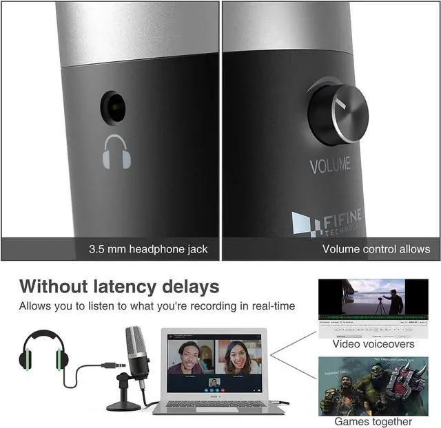 [Monitoring and Mic Gain Knob] Recording USB microphone for computer equipped with a 3.5 mm headphone jack allows you to listen to what you're recording, without noticeable latency delays. USB microphone for podcasting with volume control allows easy input level adjustment. Particularly good for video voiceovers, podcasts, YouTube video, skype conferences, VOIP calls and so on.