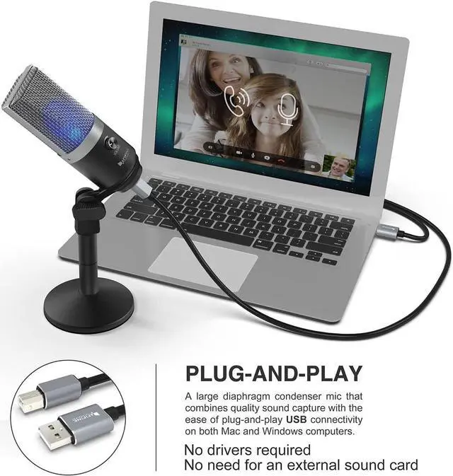 [Multi-Purposed Condenser Mic] A large diaphragm condenser caridoid mic that combines quality sound capture with the ease of plug-and-play USB mic connectivity on both PC and laptop. No drivers required, no need for an external sound card, the USB microphone laptop makes it easiest to sound good on a podcast, livestream, video call, or most any other kind of recording.