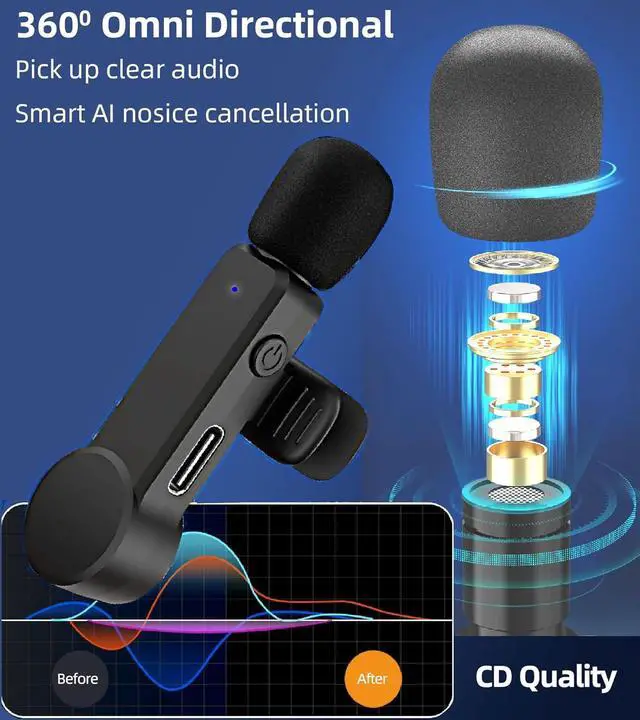 Microphone Noise Canceling: upgraded smart noise reduce chip inside, this phone external microphone record clear voice, a very convenient condenser wireless clip lapel mic for Android phone, USB C port devices