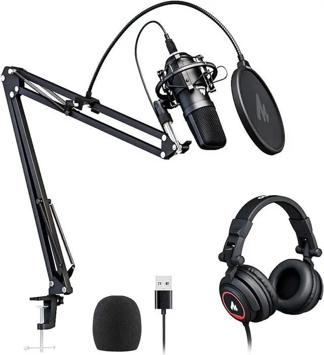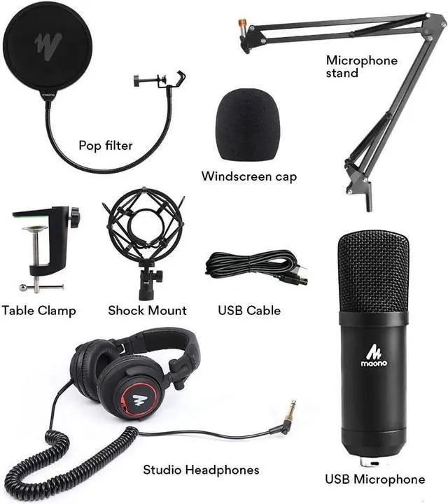 Package List And Warranty Wired Headphones+Condenser Mic + Adjustable Scissor Arm Stand + Metal Shock Mount + Pop Filter + Foam Mic Windscreen + Table Mounting Clamp + USB-B to USB-A Cable+ 3.5 mm to 6.35 mm Adapter. MAONO products provide a 12-Month warranty to ensure a better shopping experience