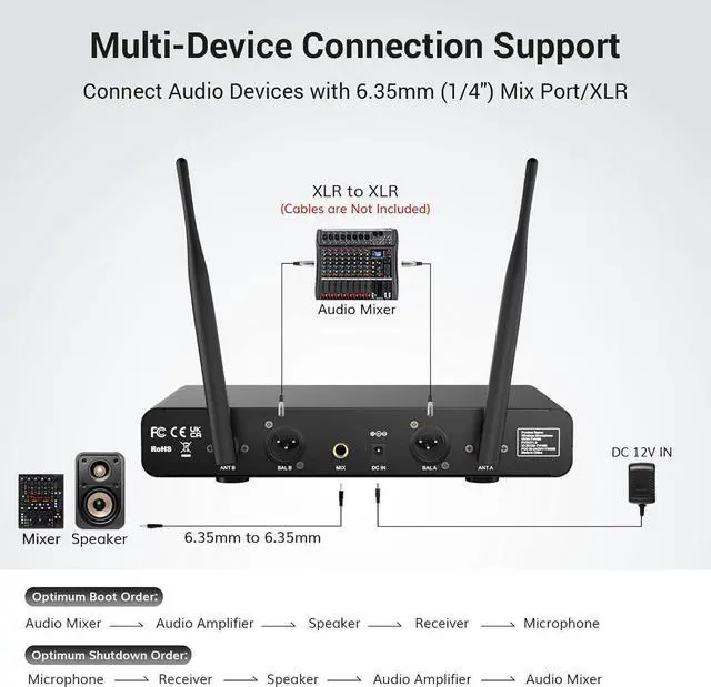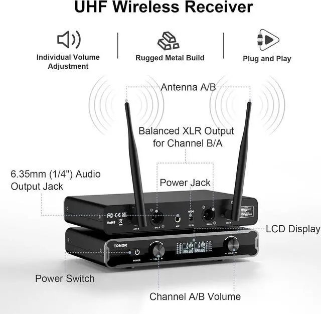 Easy to Use: Our wireless mic and receiver automatically pair when turned on. There is a separate volume control (VOL. A & VOL. B) for each wireless microphone. This makes it ideal for various occasions such as home karaoke, stage performances, weddings, and more.