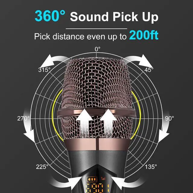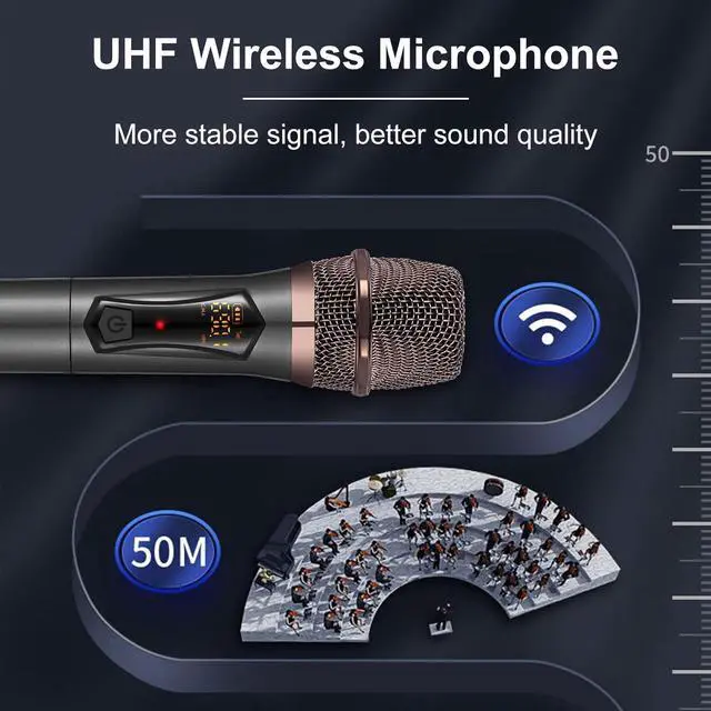 Upgraded MicrophoneLong distance wireless karaoke microphone: Upgrade the wireless distance to 160 feet (50 meters), upgrade the microphone manufacturing process, signal stability No delay No radiation Anti howling Anti interference Chip frequency adjustable Distortion <0.1% 15 UHF adjustable channels. The microphone casing is made of ABS material, which is harder, lighter, and more wear-resistant.