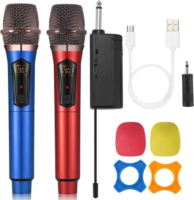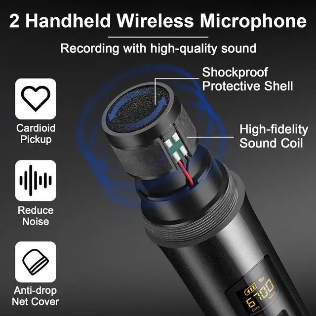 2 Wireless Microphones ALPOWL UHF wireless mics using latest Super high frequency technology to ensure stable signals for singing. Two microphones use noise reduction technology, and professional audio processors can adjust high and low frequencies to ensure sound quality while transmitting your voice more efficiently for a better singing experience