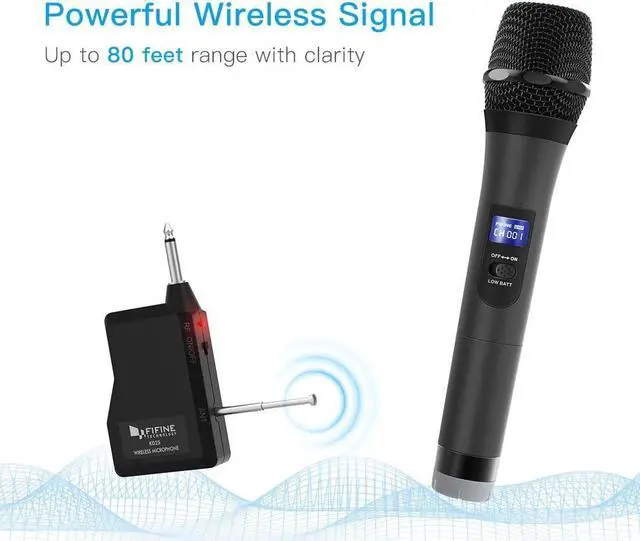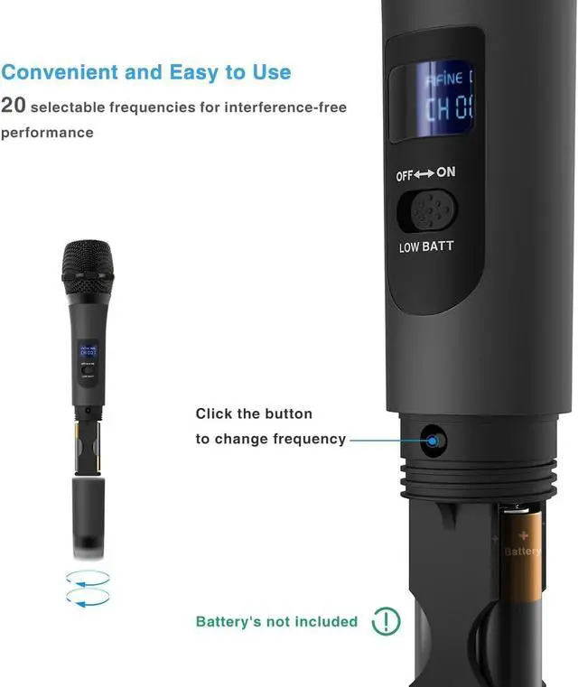 Convenient and Easy to Use--Plug and play. 20 selectable frequencies for easy adjustment when using in different locations. Low-battery warning on receiver and cordless microphone enable constant monitoring of system operation. Comfortable and easy to hold microphone. Great gift for karaoke nights and smaller house parties to have some fun over the speakers.