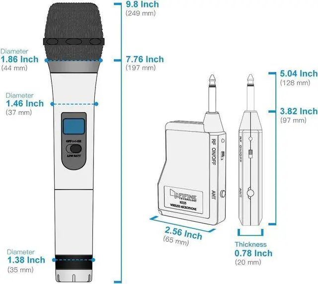 What You Get--Lightweight, versatile, compact wireless mic and receiver with durable 1/4 inch jack ( 6.35 mm) output for DJ mixers and guitar amps. (batteries are NOT included). If you have any questions, feel free to contact us directly via Amazon messager.
