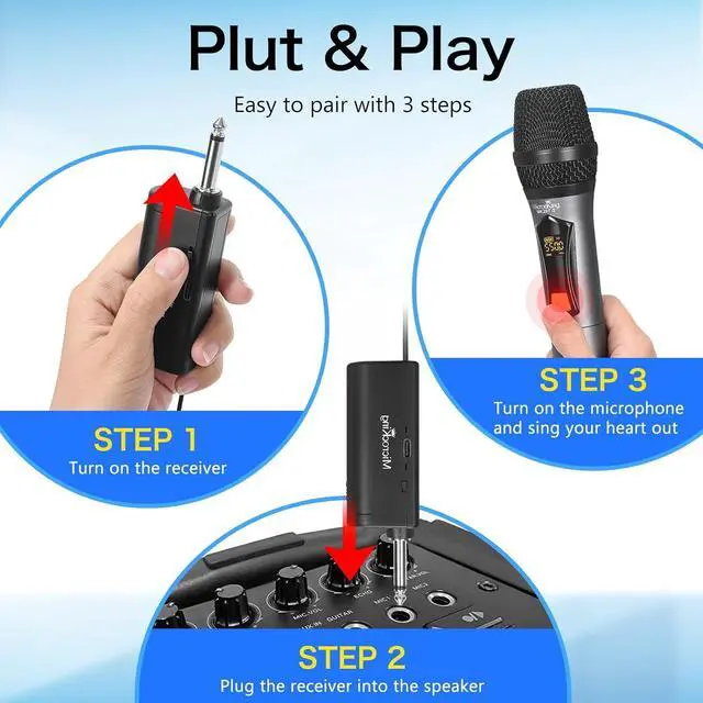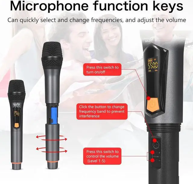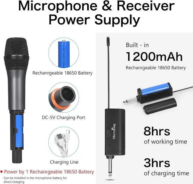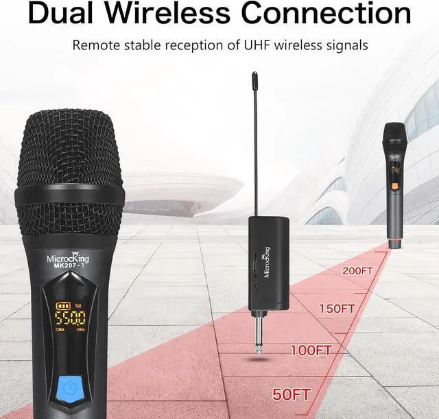 Multiple Frequencies: MicrocKing wireless microphone is pre-programmed with 10 selectable frequencies, all with superb signal stability and eliminating radio interference. The handheld microphone can change frequencies at any time, and then the receiver will automatically adjust to the corresponding frequency, simplifying your preparation work.