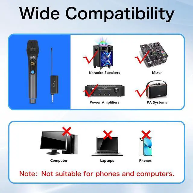 Wide Application: The microphone can be connected to a wide range of audio systems, including speakers, amplifiers, and wireless microphone systems. Wireless microphones will give you mobility and freedom, perfect for stage performances, presentations, churches, weddings. If you have no sound from your microphone, make sure you have sufficient power to the microphone and receiver. We offer a 1 year warranty and free replacement service. Please feel free to contact us when there is a product quality issue or any other problem. Your email will be answered within 24 hours.