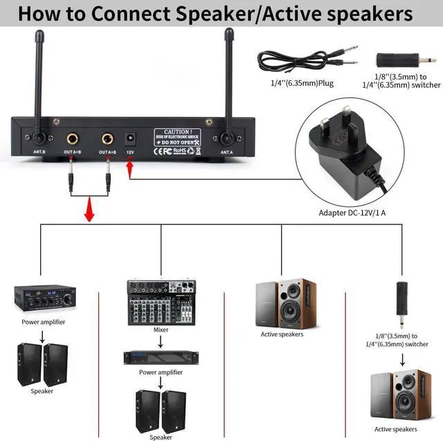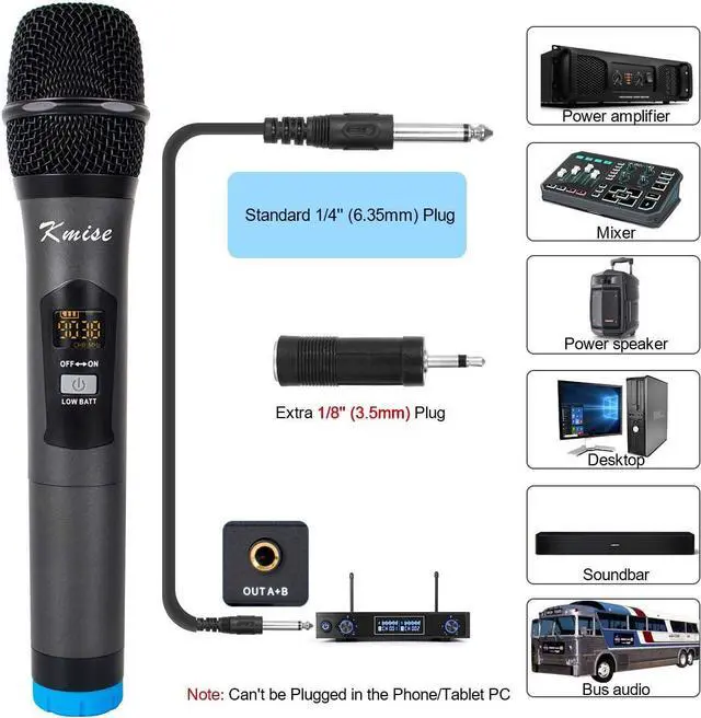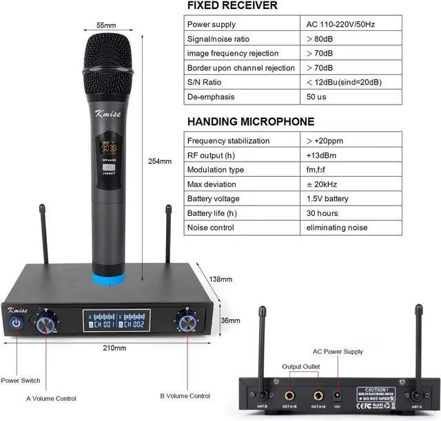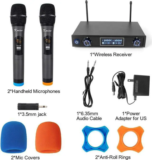 You will receive: 2 handheld microphones, 1 receiver, 2 anti-slip rings, 1 6.35 mm audio cable, 2 microphone covers, 1 manual. If there are any problems with the wireless system receiver or microphones, please refer to the manual or contact us immediately to help solve the problem.