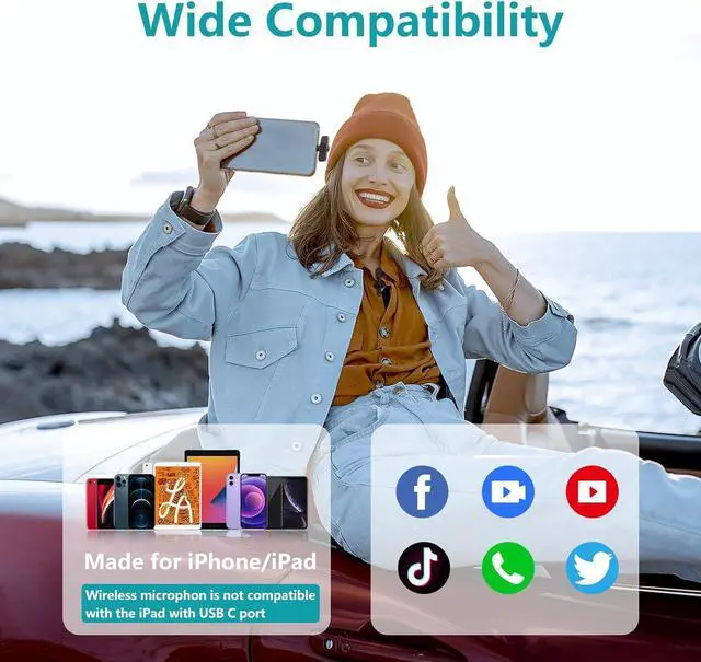 Compatible with iPhone/iPad: This wireless lavalier microphone works with iPhone 5/6/7/8/11/12/13, 7 Plus/8 Plus/11 Pro/11 Pro Max/12 Pro, X, /XR/XS/XS Max, and iPad 2/3/4, iPad Air series, iPad
