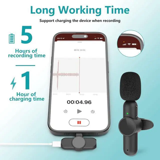 Not limited by time: Each wireless microphone has up to 5 hours of working time. Up to 10 hours alternated with two lavalier microphones. You can charge the iPhone and iPad through the wireless receiving lighting jack when the device is low power. Dual-microphone wireless can meet the demand for long-time recording.